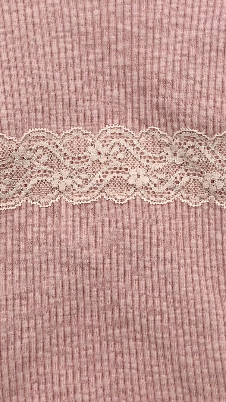 シンプルなピンクのニットに、レースがあしらわれた見た目上品で可愛らしいデザイン。
